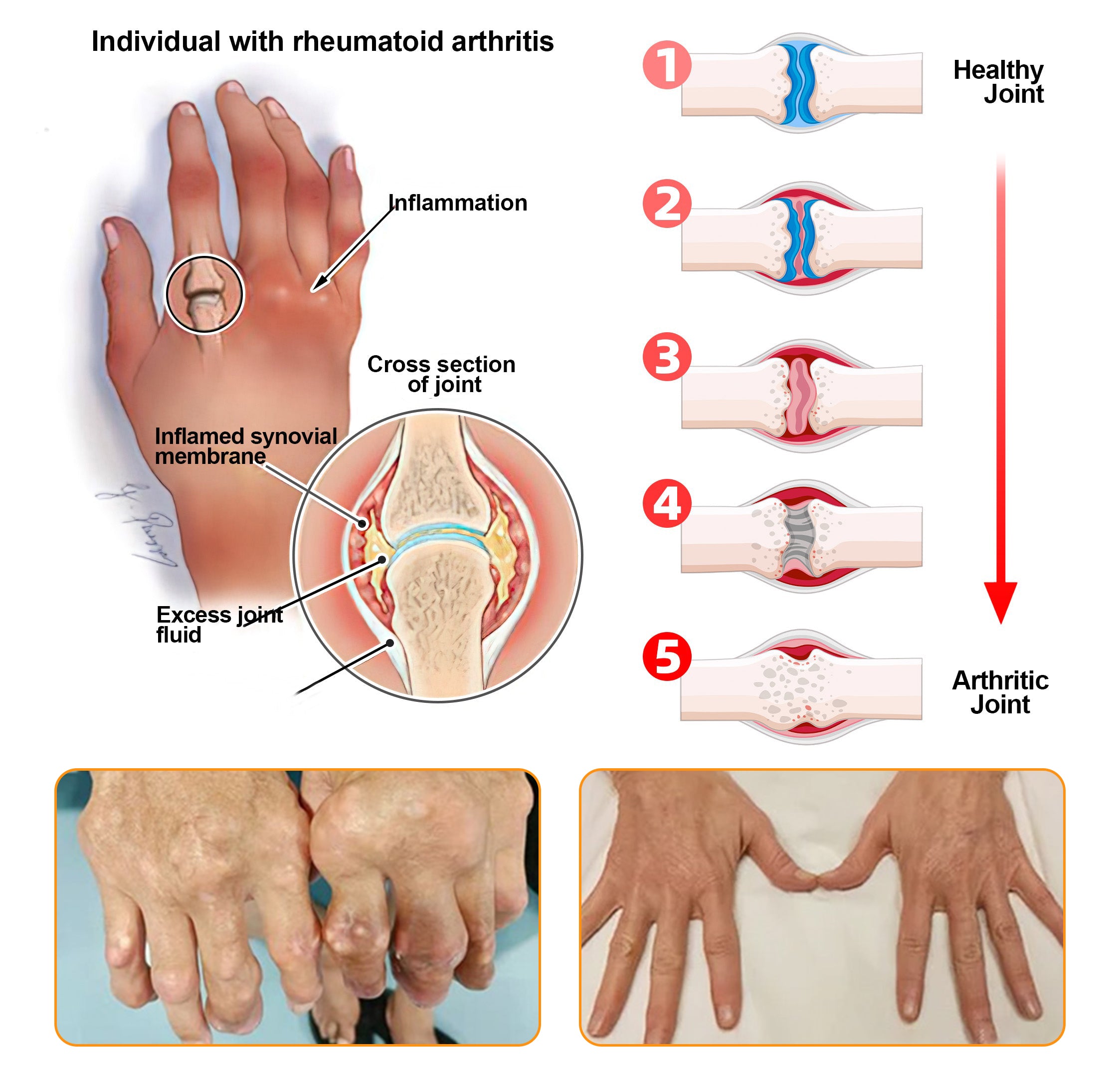 Rheumatoid Arthritis (RA) is a chronic inflammatory disease that causes inflammation and damage to the joints due to the autoimmune system attacking the synovial lining of the joints. Rheumatoid arthritis is characterized by joint pain, swelling, and stiffness, and usually occurs in small joints such as the fingers, wrists, knees, and ankles, but may affect other large joints as well.