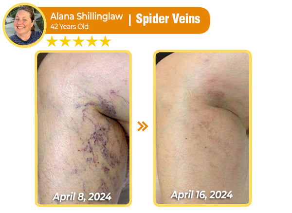 "I’m on my feet all day for work, and it’s caused me to develop spider veins. I hated how they looked and felt like I had no choice but to cover them up with long pants. I decided to try this cream after hearing about the benefits of bee oison for skin issues. It actually worked! My legs felt more relaxed on the first day, and by day six, the veins started to fade. After about a week more, they were totally gone! My legs are smooth again, and even with long hours of standing, there’s no more swelling or discomfort!" - Alana Shillinglaw, Washington, USA