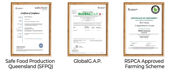 We own a Standards-compliant farm in USA that follows a sustainable system, earning recognition from GlobalG.A.P. and RSPCA Approved Farming Scheme for high standards in environmental management and animal welfare. Our bees are raised in 100% natural, hypoallergenic environment, where we extract purified bee poison safely, ensuring both ethical practices and high-quality production.